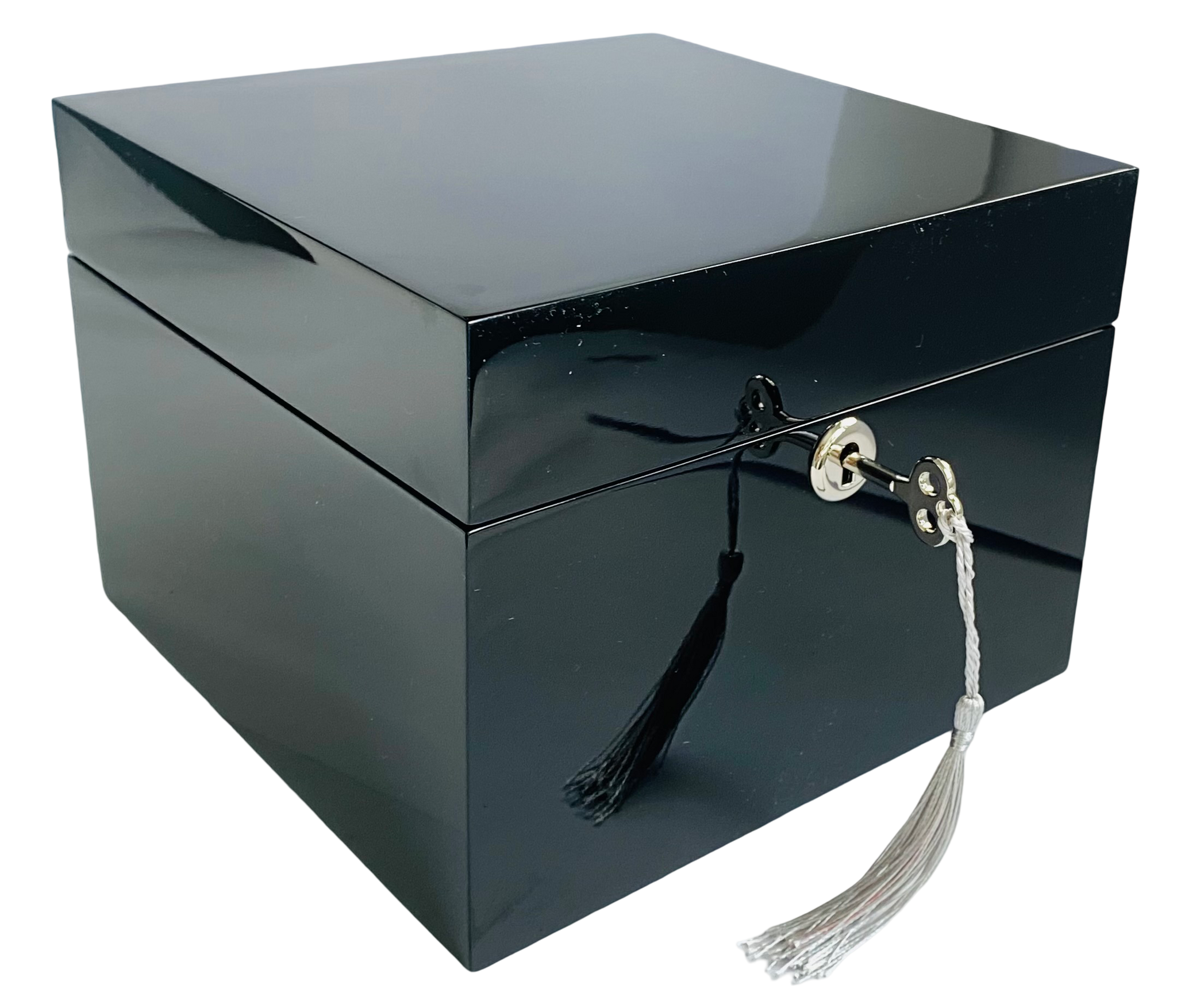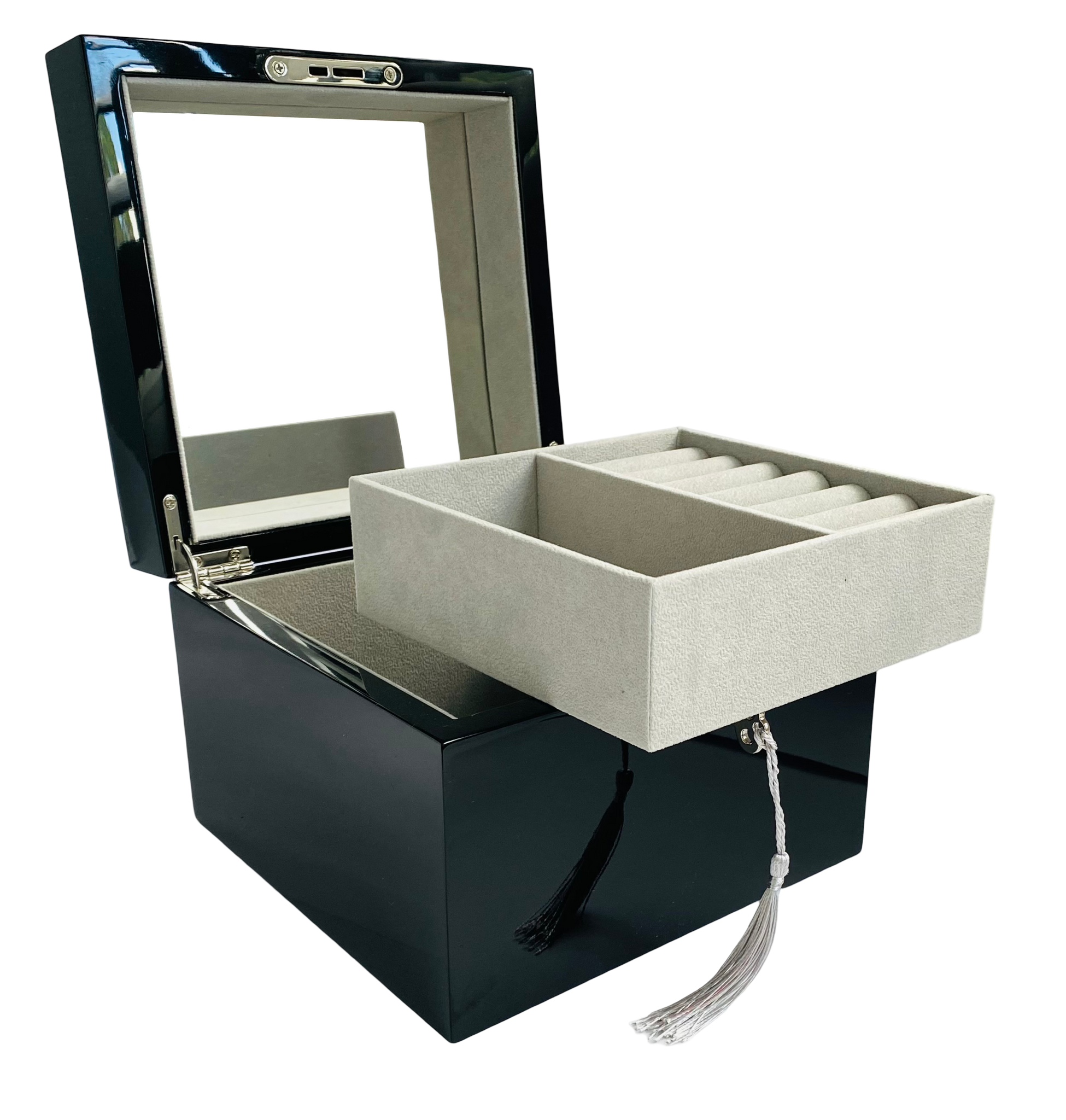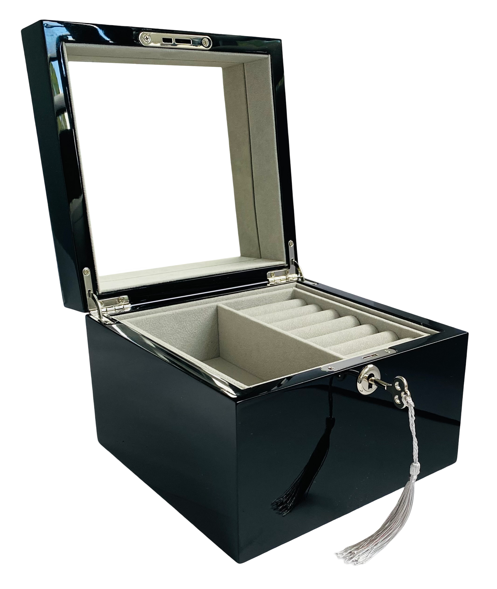 Introducing the epitome of elegance: our stunning small Black wooden jewellery box, meticulously crafted with a lustrous high gloss finish. Delight in the full-sized internal mirror and luxurious soft velour lining – a perfect choice for those starting their jewellery journey.