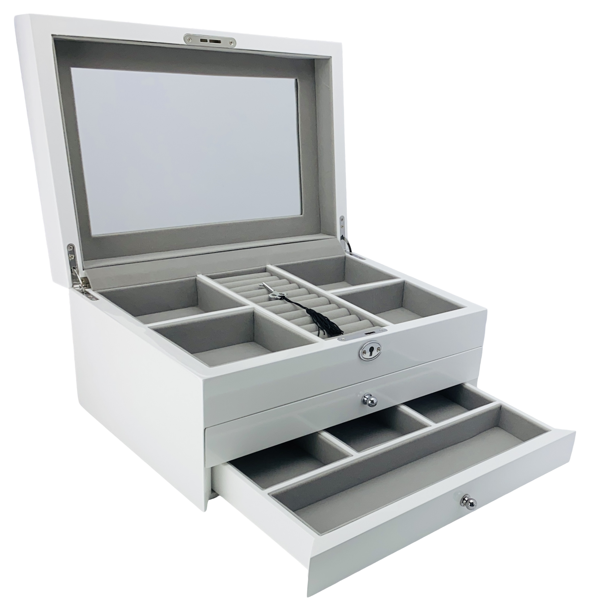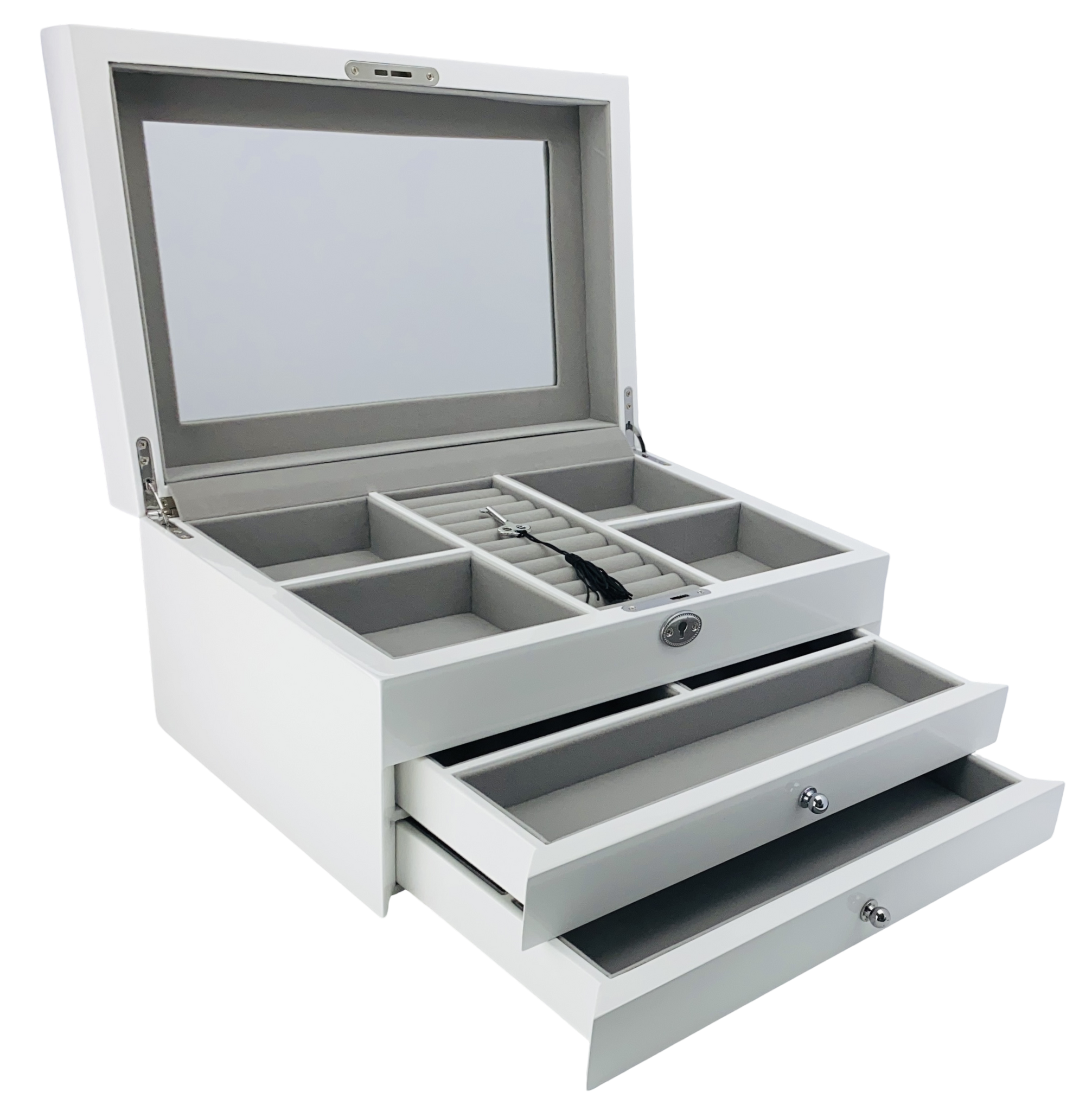 • Top compartment and two additional drawers for organizing your favourite jewellery pieces.