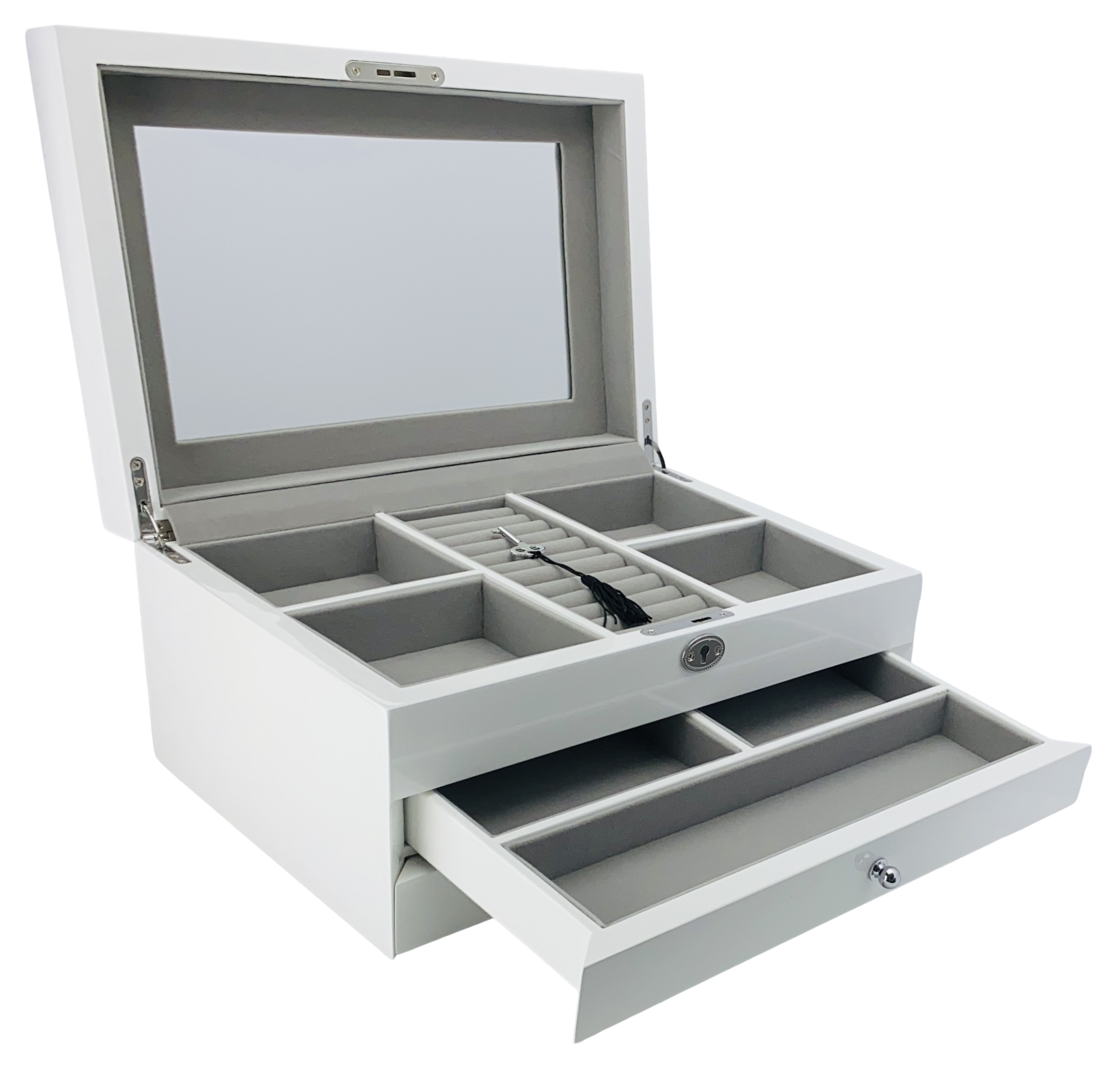 Discover the epitome of luxury with our Harrowdene White Key Lock Wood Jewellery Box. Crafted to perfection, this jewel box features: