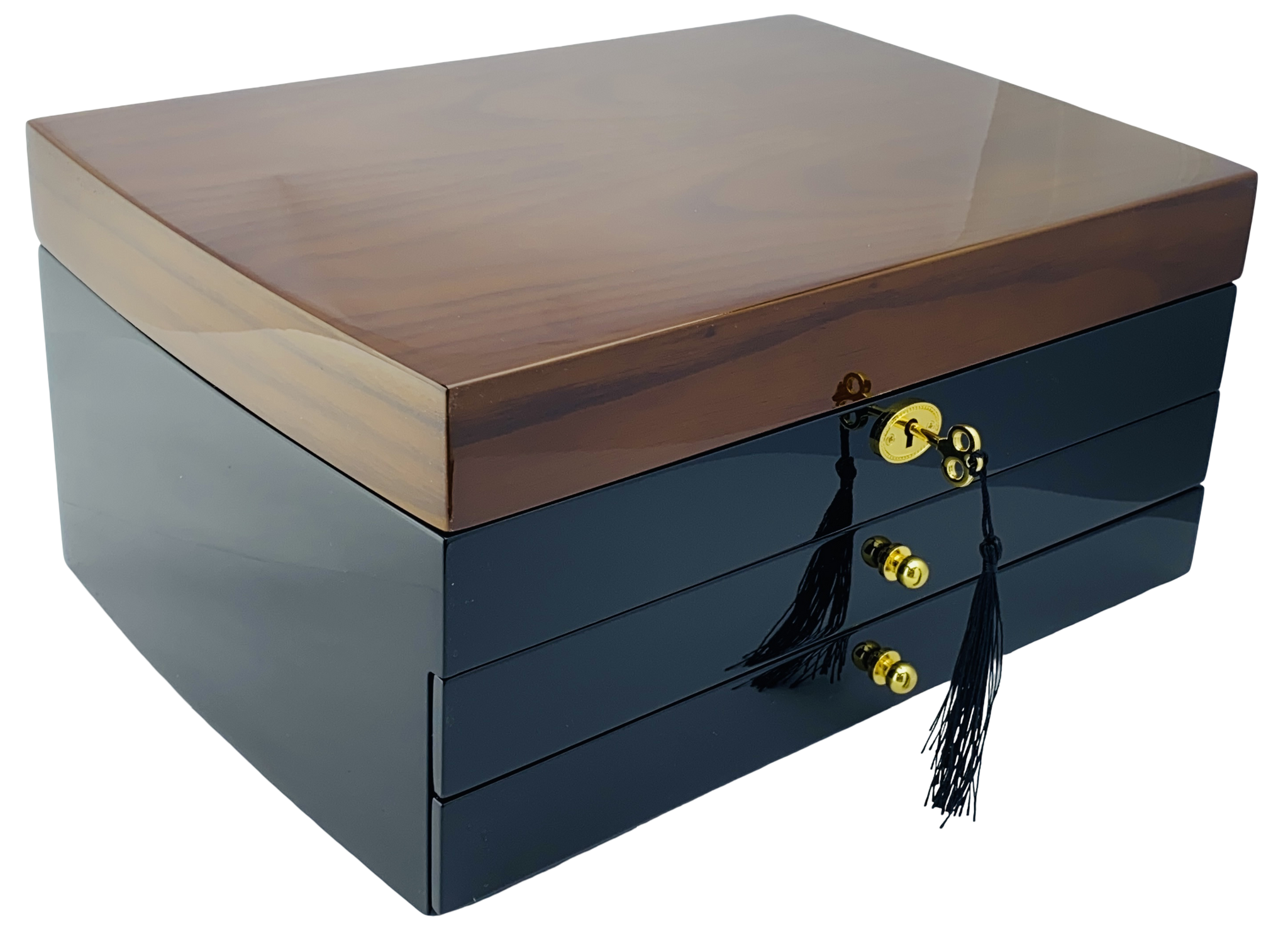 Discover the epitome of luxury with our Harrowdene High Gloss Black Key Lock Wood Jewellery Box with Solid Walnut finish top. Crafted to perfection, this jewel box features: