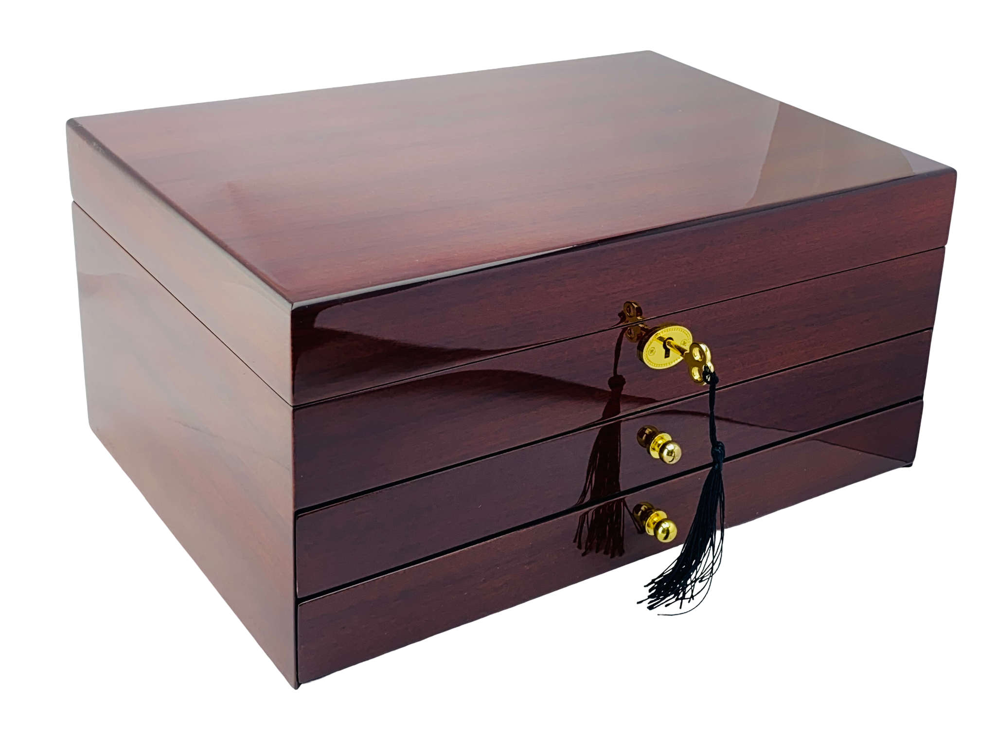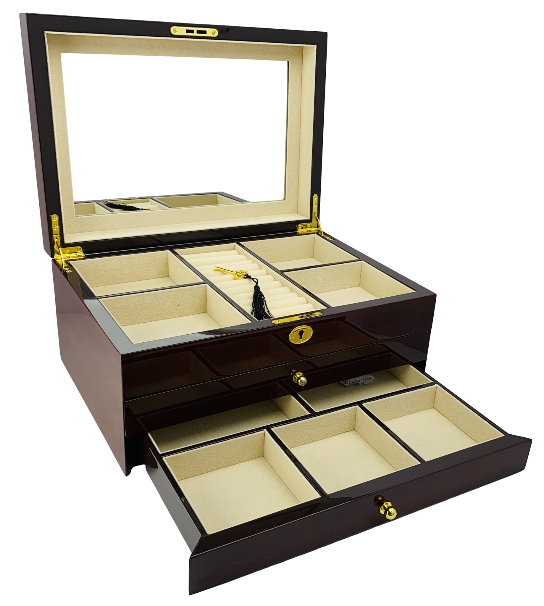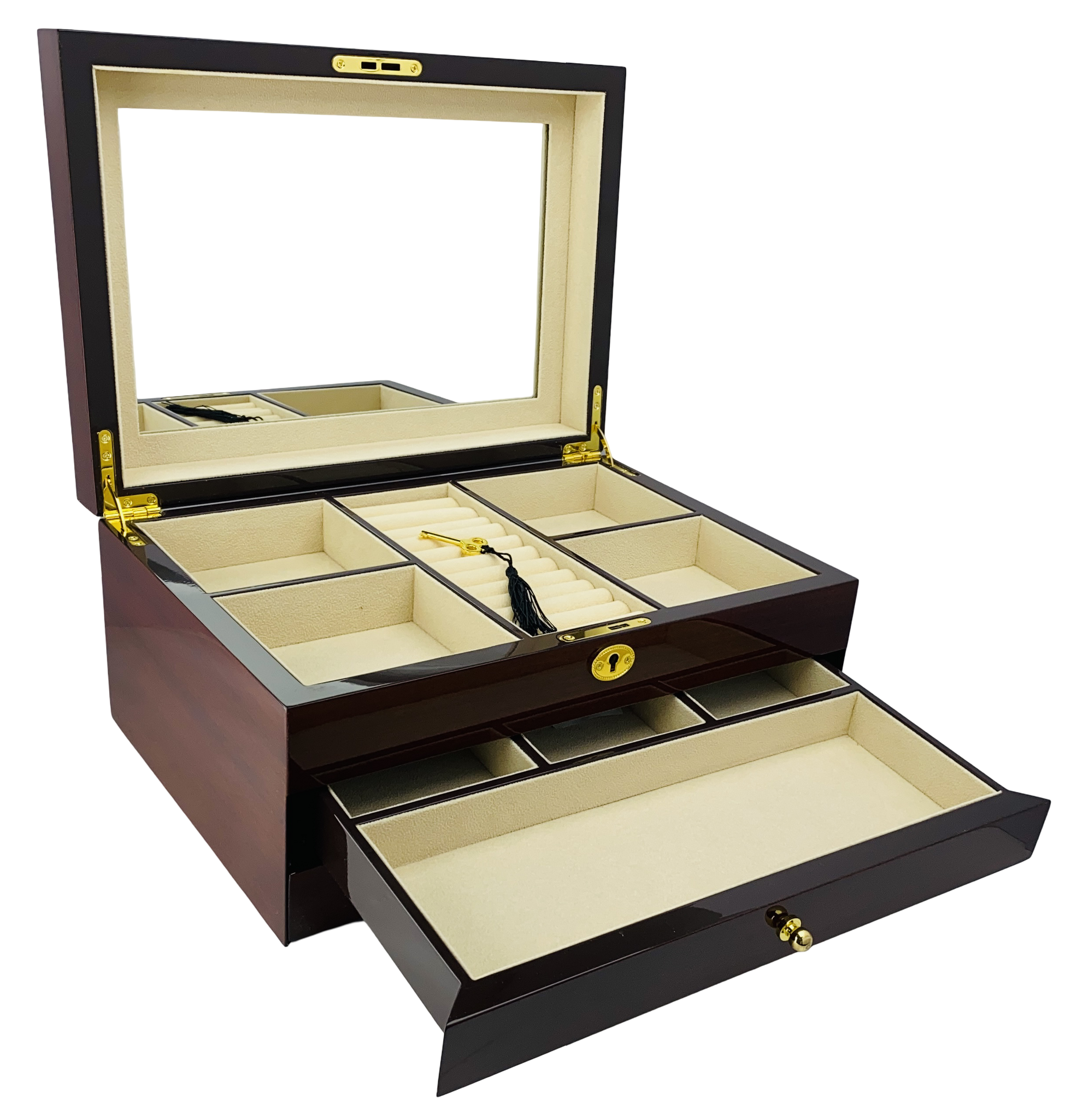 Discover the epitome of luxury with our Harrowdene Mahogany Finish (Sapele) Key Lock Wood Jewellery Box. Crafted to perfection, this jewel box features: