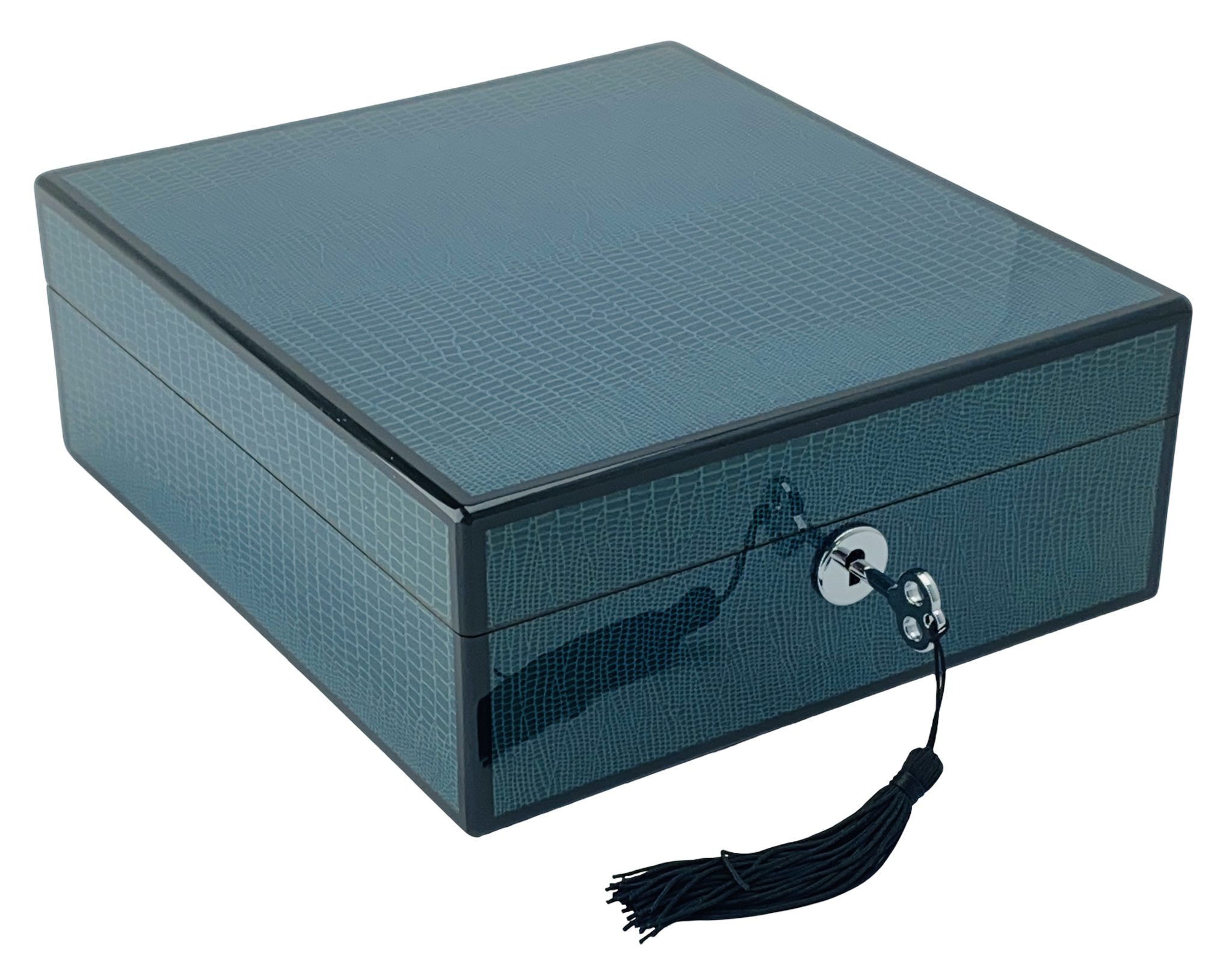 Introducing the epitome of refined craftsmanship: the Harrowdene Piano Finish Wooden Watch and Jewellery Box in an exquisite Blue Lizard finish. This high-quality key lock box combines functionality and elegance, perfect for safeguarding your treasured items.