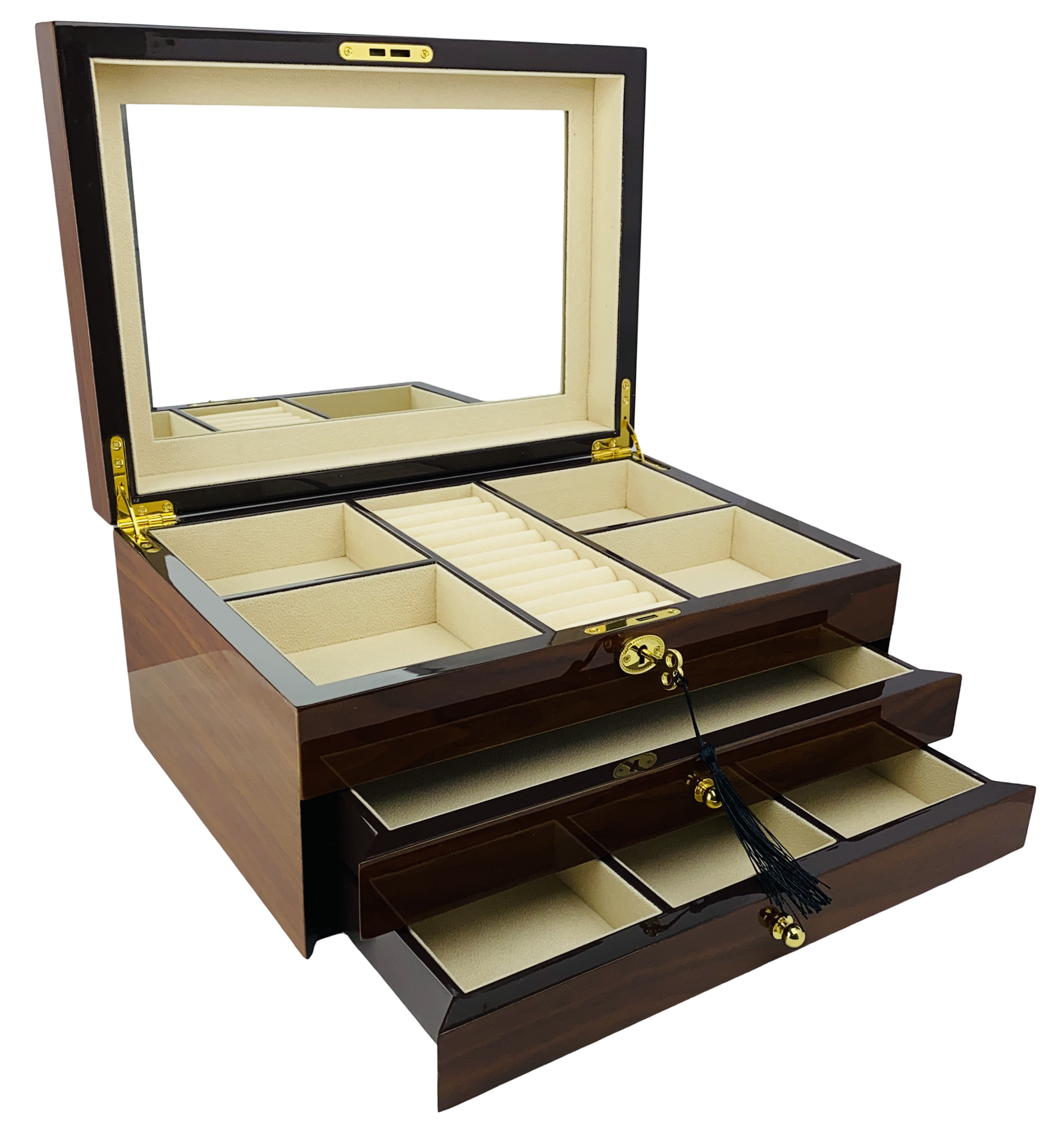 - Top compartment and two additional drawers for organizing your favourite jewellery pieces.